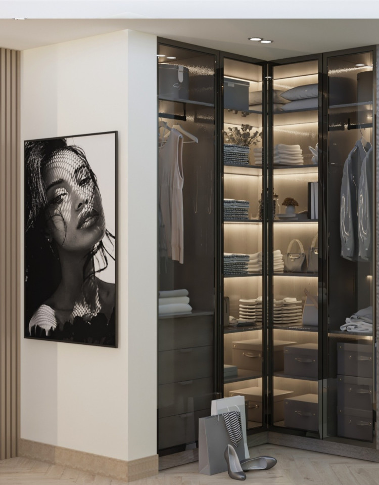 The kitchen is closed and designed in a modern style with a focus on efficiency and elegance It features matte cabinetry and built in appliances that blend seamlessly into the design
