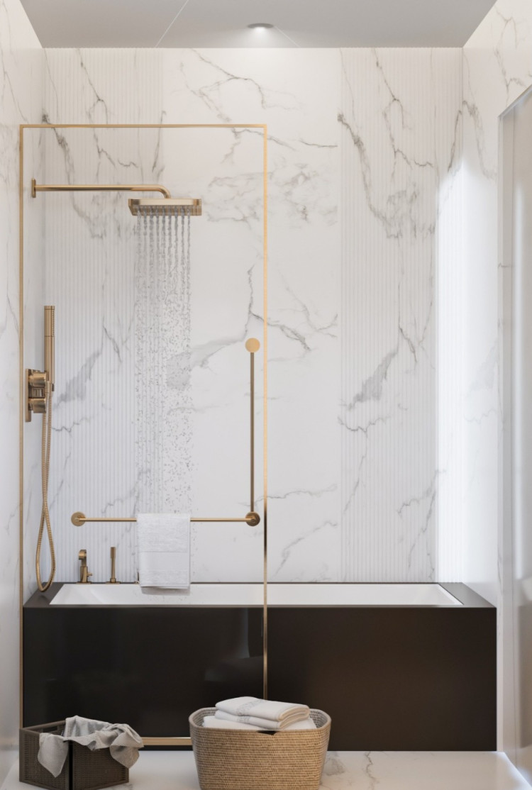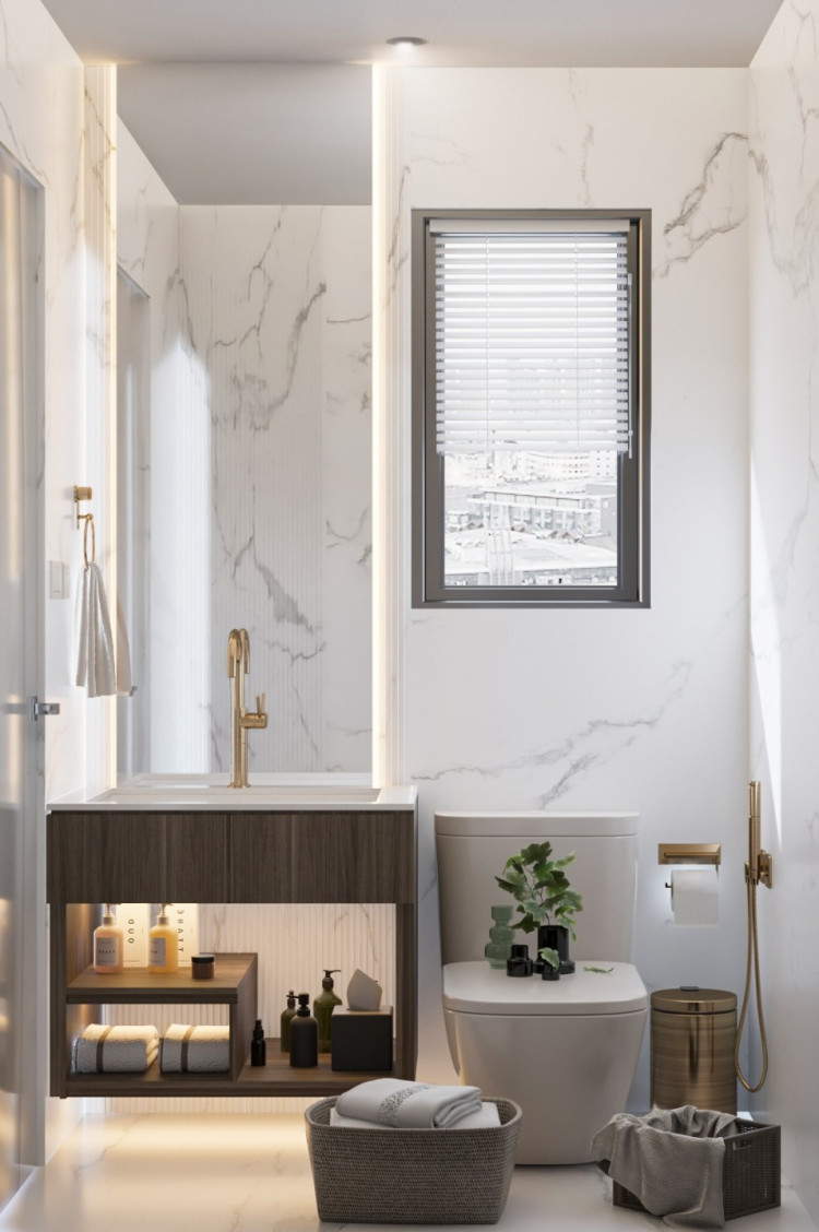 The bathrooms feature modern fittings and large format ceramic tiles They include backlit mirrors wall mounted vanities and frameless glass shower enclosures providing a sleek and clean finish