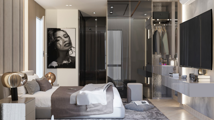 The master bedroom offers a calm and refined atmosphere It includes a private en suite bathroom a large sliding wardrobe and a soft upholstered headboard that adds both comfort and style