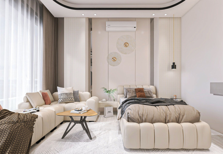 The space is filled with natural light through large windows while subtle lighting elements enhance the ambiance The design includes a built in TV unit and an accent wall finished with natural textures to add character and depth