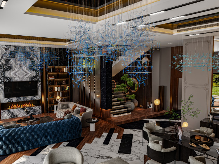 Wall finishes and contemporary accessories, including illuminated shelves, decorative bookcases, and artistic pieces, provide visual depth and sophistication. The marble fireplace with an integrated TV showcases the harmony between advanced technology and luxurious décor.