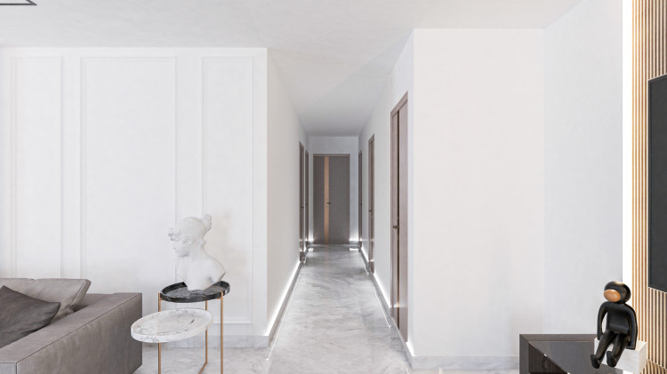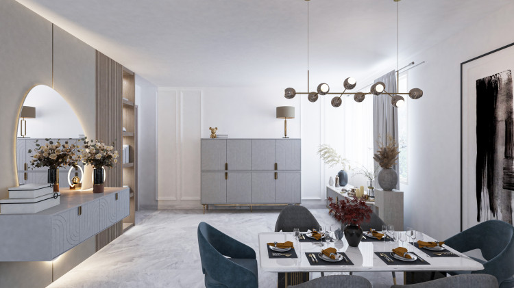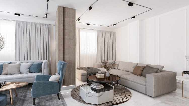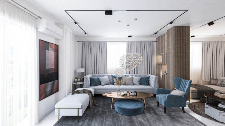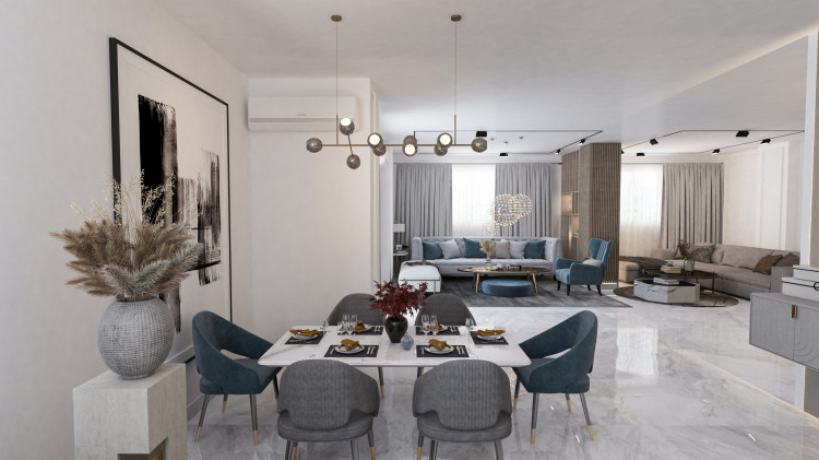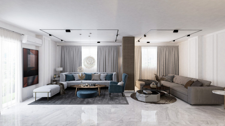 High-end materials like polished marble flooring and rich velvet fabrics in the furniture elevate the overall look, while modern lighting fixtures highlight the details and distribute light evenly across the space. Architectural elements such as columns were cleverly integrated to subtly divide the space without compromising openness or flow.