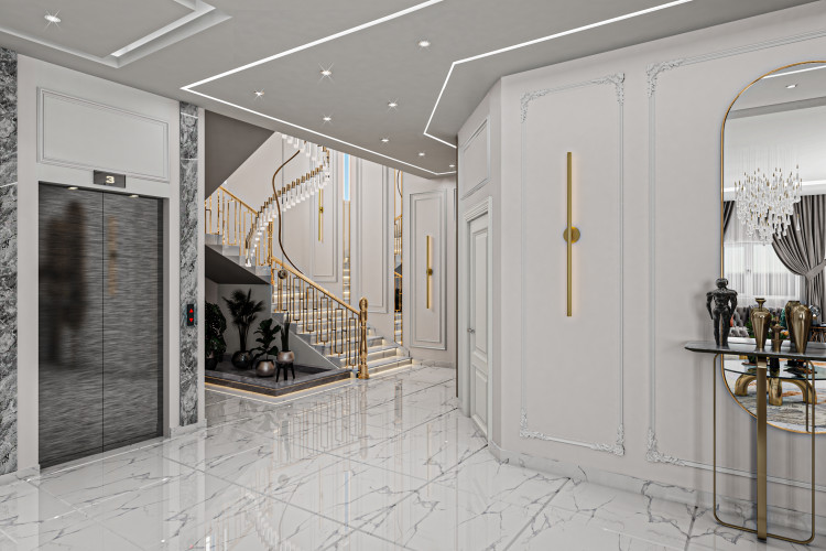 A luxurious majlis design in a Saudi villa that blends elegance and sophistication through precise architectural details and a neutral color palette inspired by modern European style natural marble is used for the TV wall creating a sense of richness and luxury the lighting is thoughtfully distributed using suspended fixtures that softly reflect light across the walls and ceiling the furniture is carefully selected with a chic green leather sofa adding a unique touch of color complemented by patterned cushions that enhance the modern atmosphere the space features a side bookshelf with soft lighting showcasing books and decorative art pieces that elevate the visual appeal the flooring is finished with glossy white marble tiles accented with subtle gray veins to create a sense of openness and harmony the design emphasizes smart space utilization and attention to detail making this majlis a true example of refined interior design and high end finishing in luxury villa projects in Saudi Arabia