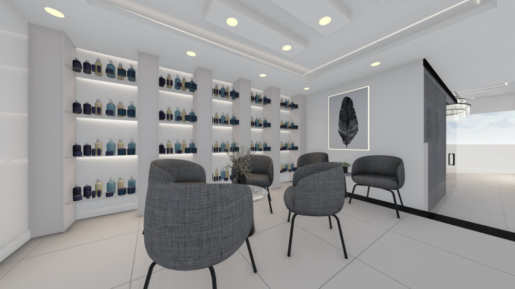 The waiting area is designed with stylish comfortable chairs and a simple table complemented with natural greenery to bring life into the space While the hanging chandelier adds a sophisticated focal point that elevates the entire atmosphere