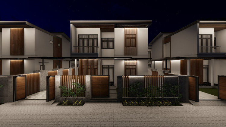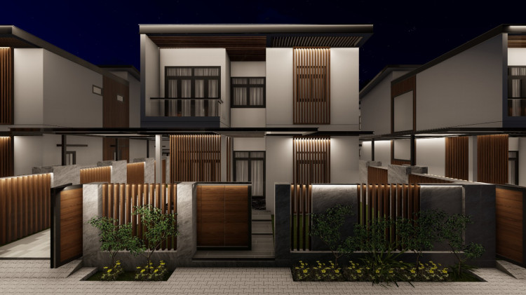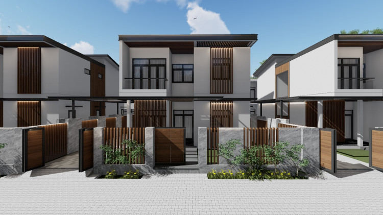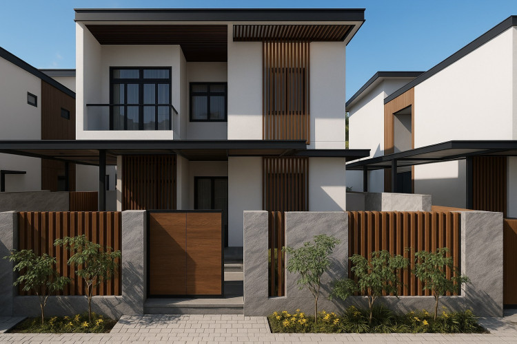 A modern villa façade design that blends elegance with functionality, featuring clean lines and a minimalist structure The use of neutral colors such as white and gray creates a sense of spaciousness and calm, while the integration of wood elements adds warmth and natural sophistication, giving the exterior a luxurious contemporary touch