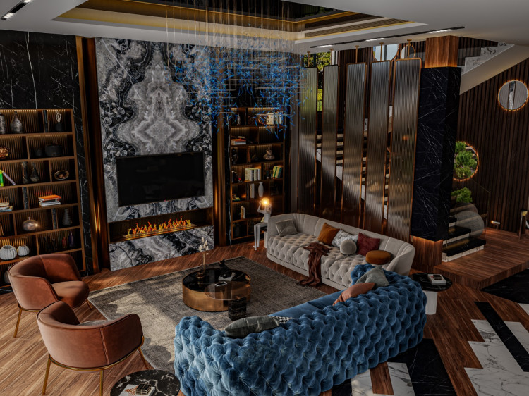 الديكورات الجدارية والإكسسوارات العصرية مثل المكتبات الجانبية والأرفف المضيئة واللوحات الفنية تضيف عمقًا بصريًا يميز التصميم. كما أن المدفأة الرخامية مع التلفاز المدمج تعكس الجمع بين التكنولوجيا والديكور العصري الفاخر.