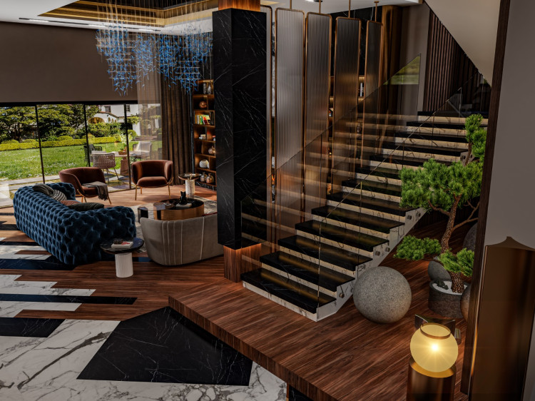 في هذا المشروع نرى نموذجًا متكاملًا للتصميم الداخلي العصري الذي يجمع بين الفخامة والعملية حيث تم الاعتماد على مجموعة من الخامات الراقية مثل الرخام الطبيعي الأسود والرمادي المستخدم في الجدران والأرضيات والذي يعكس لمسة فنية أنيقة، إلى جانب الخشب الدافئ الذي أضاف إحساسًا بالدفء والراحة داخل المساحة.