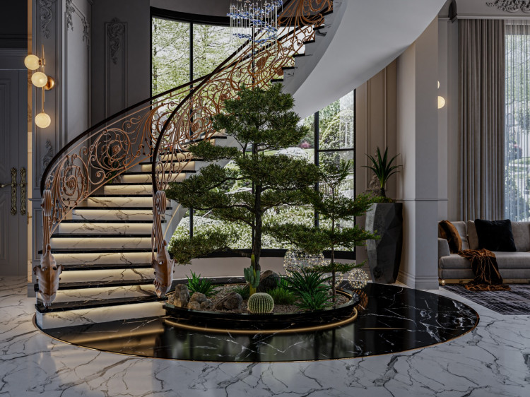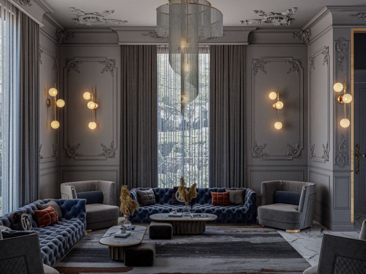 تم اختيار الأثاث بعناية فائقة ليعكس طابع التصميم الكلاسيكي بداية من الكنب الكابيتونيه الفاخر ووصولًا للكراسي الدائرية المصممة بخامات ناعمة وتنجيد هندسي متوازن كما تم الاهتمام بالقطع الديكورية التي تعزز روح التصميم مثل وحدات الإضاءة الحائطية الذهبية والثريا الفخمة التي تتوسط الغرفة بانسيابية أنيقة