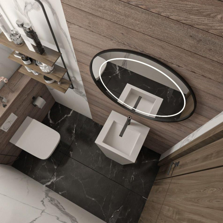 الحمامات مصممة بأسلوب عصري باستخدام بلاط سيراميك كبير الحجم ومرايا مضيئة من الخلف ووحدات حوض معلقة وكابينات شاور زجاجية بدون إطار لخلق طابع نظيف ومرتب