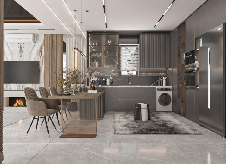 المطبخ مغلق ومصمم بأسلوب مودرن يجمع بين العملية والأناقة يحتوي على وحدات تخزين بملمس مطفي وأجهزة مدمجة تعزز من الشكل العام وتوفر المساحة